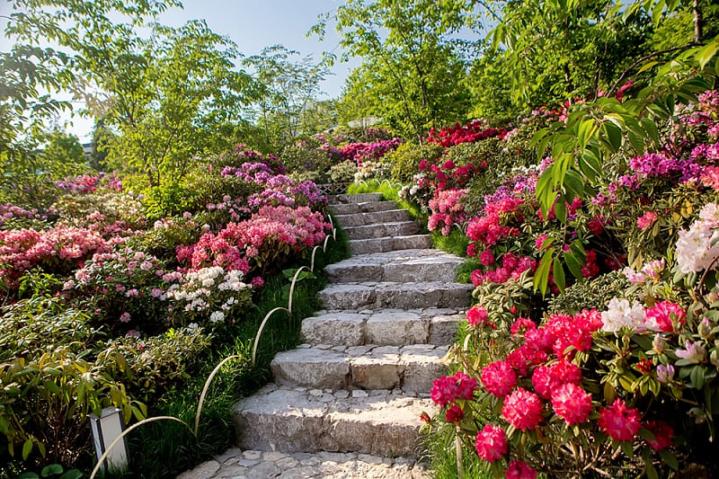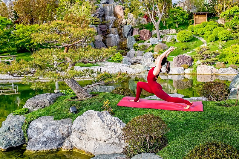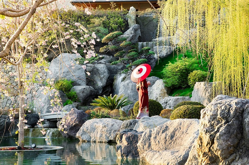 Территория сада разделена на три террасы и занимает шесть гектаров. Здесь раскинулись водопады, ручьи, пруды с «парящими» камнями, а необычный пейзаж сформировали растения, привезенные из заповедников Японии и Европы — их здесь свыше 3000 видов.