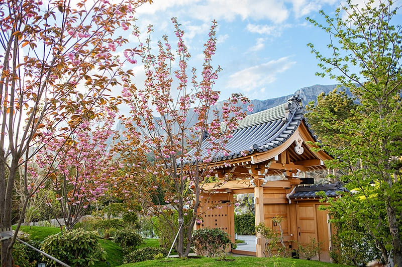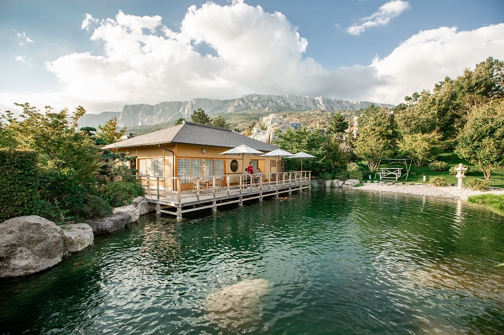 Для создания традиционных строений и сложного ландшафта из Японии морем доставили дерево и 1700 тонн камней вулканической породы. Ворота сада, Чайный домик, храм медитации Дзен-До, и имение Сёгуна построены из японского кипариса, согласно канонам аутентичной архитектуры, без единого гвоздя. Мостики, тропинки, термальные купели — каждый элемент не случаен и таит глубокую мудрость.